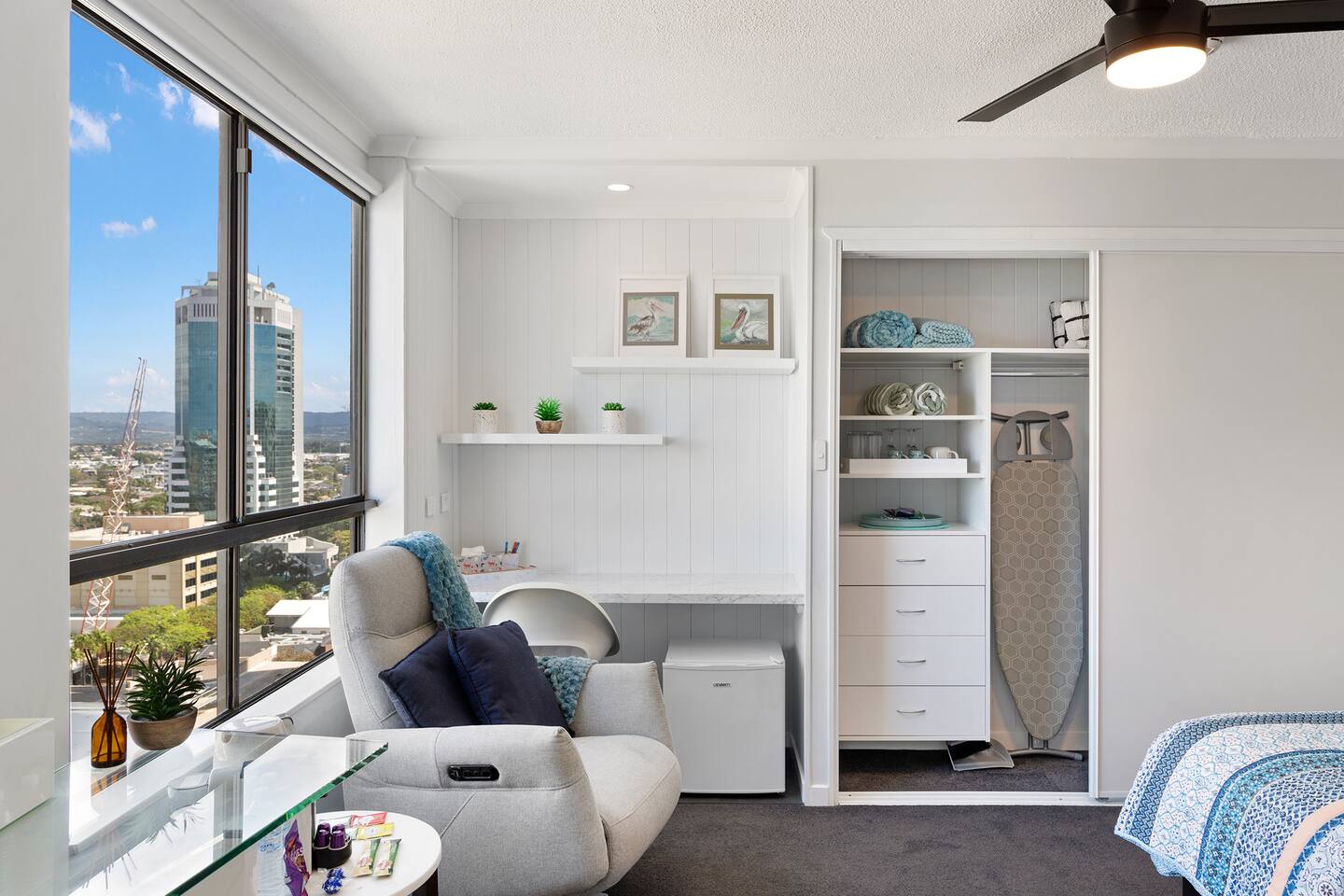 Welcome to your tranquil oasis in the heart of Surfers Paradise! This brand new one-bedroom studio offers breathtaking water views from the 17th floor, providing the perfect backdrop for your coastal getaway. Step into a beautifully designed space featuring a modern ensuite, luxurious bedding, Large Queen size bed, and plush bath towels. Unwind in comfort as you enjoy a coffee station, complimentary water, and a convenient bar fridge for your drinks and snacks. Private access to the studio.