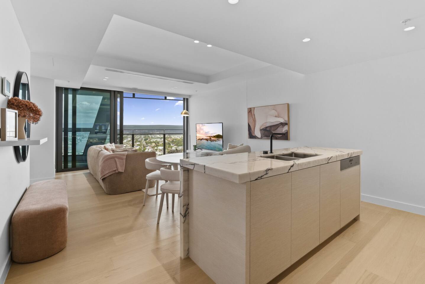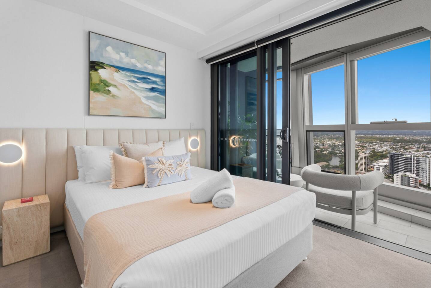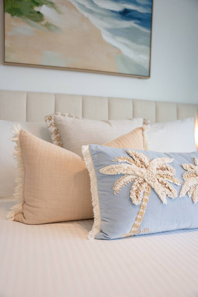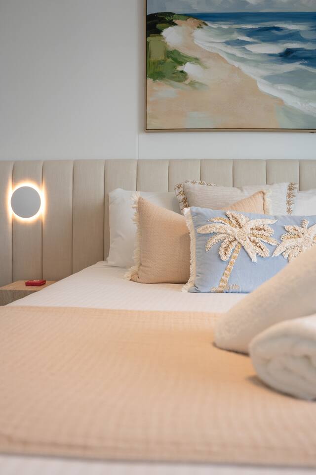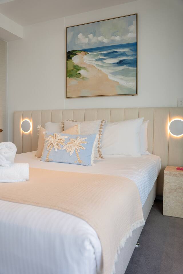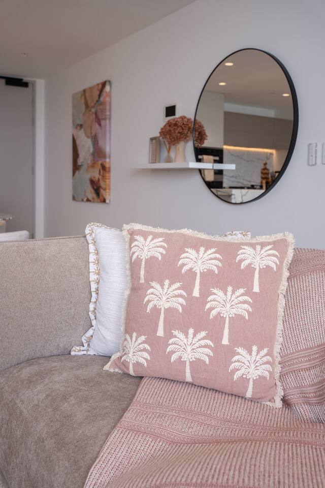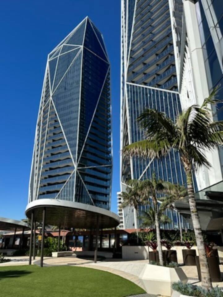 Inside, the space feels calm, refined and effortlessly luxurious. Soft coastal tones, brand new designer furnishings, statement marble finishes and plush, hotel-quality bedding create an atmosphere that is both elegant and deeply relaxing. The master bedroom features a luxurious Queen bed and enjoys direct access to the balcony, allowing you to wake to soft morning light and sweeping views. The second bedroom offers two single beds that can be configured into a King, making the apartment ideal for couples, families or friends travelling together. Both bedrooms are fitted with state-of-the-art electronic blackout blinds, ensuring complete darkness and the kind of uninterrupted sleep you dream about on holiday. The open-plan living area flows seamlessly from the stunning marble kitchen to the lounge and balcony, making it ideal for both quiet evenings and effortless entertaining. The fully self-contained kitchen is equipped for extended stays, while fast Wi-Fi and private parking ensure total convenience. As our guest, you’ll enjoy exclusive access to Jewel’s premium resident facilities, including: • Outdoor resort-style pools • Indoor heated pool (Level 3) • Modern gym • Steam room & sauna The cinema is available to book through the security office. You’re moments from the beach, yet elevated above it all — offering privacy, comfort and uninterrupted views across the Nerang River and hinterland. This is the kind of property guests wish they booked for longer. Welcome to your Gold Coast sanctuary.