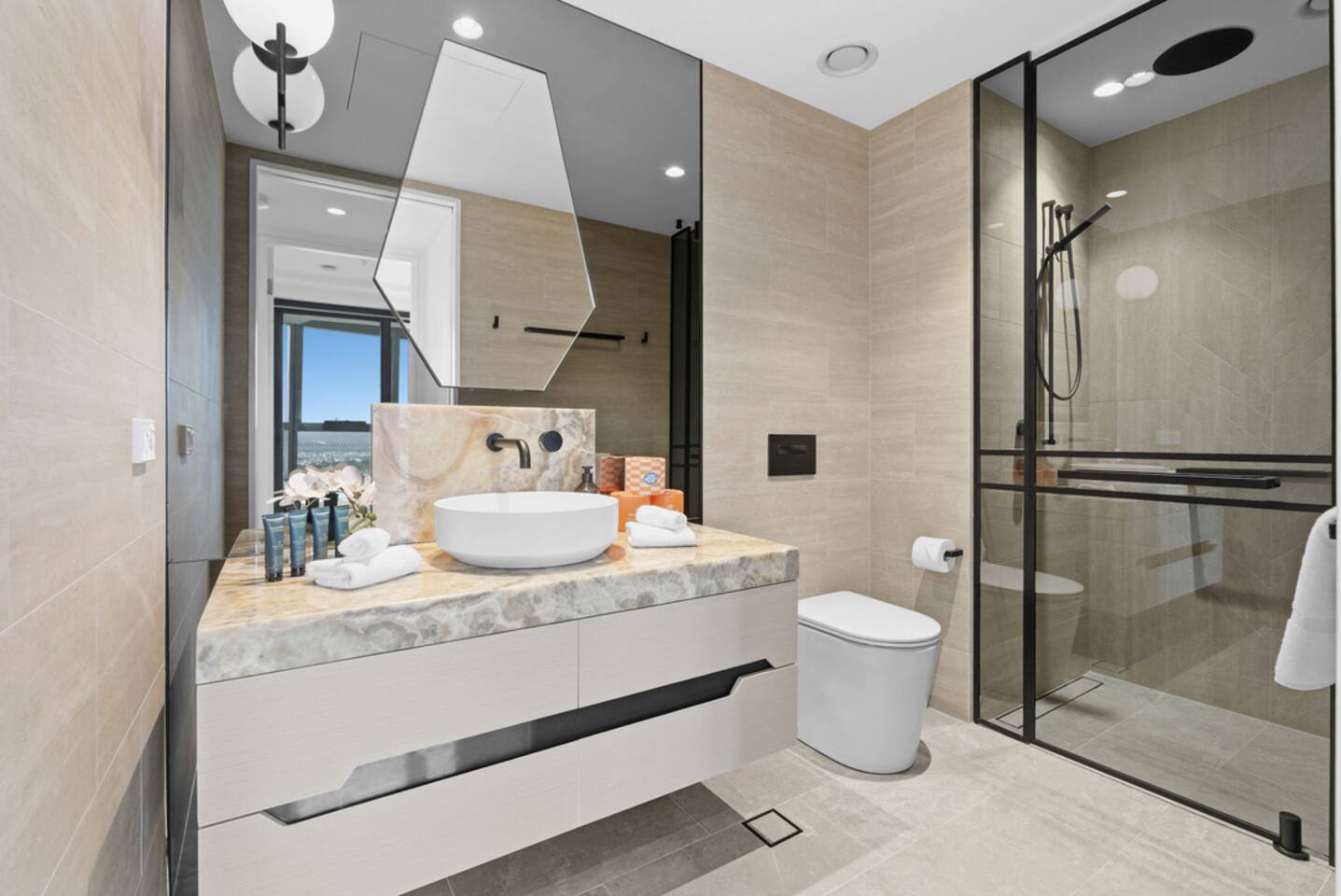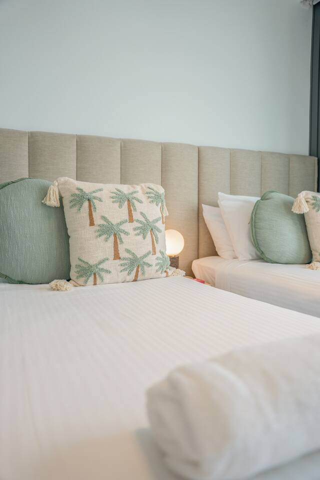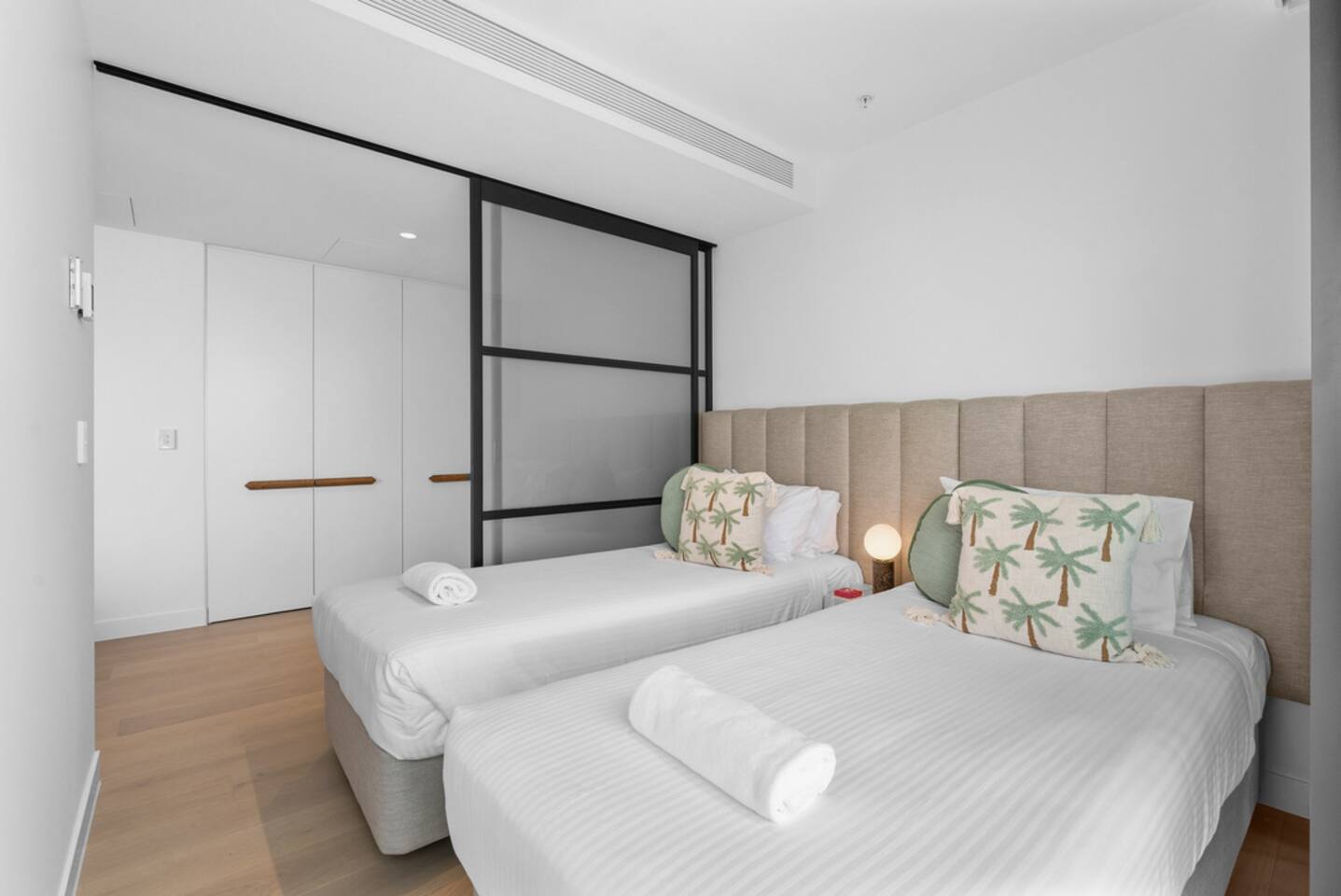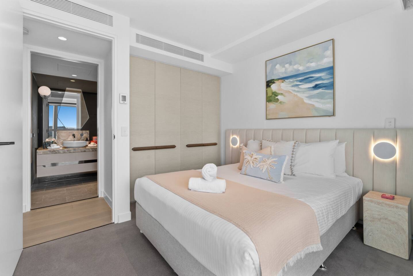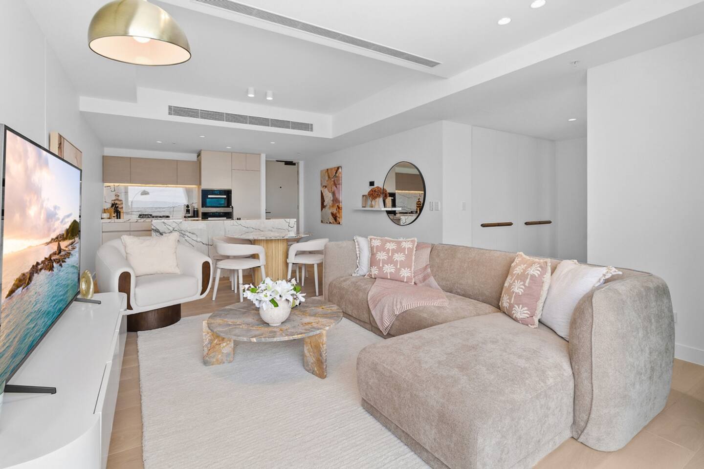 Inside, the space feels calm, refined and effortlessly luxurious. Soft coastal tones, brand new designer furnishings, statement marble finishes and plush, hotel-quality bedding create an atmosphere that is both elegant and deeply relaxing. The master bedroom features a luxurious Queen bed and enjoys direct access to the balcony, allowing you to wake to soft morning light and sweeping views. The second bedroom offers two single beds that can be configured into a King, making the apartment ideal for couples, families or friends travelling together. Both bedrooms are fitted with state-of-the-art electronic blackout blinds, ensuring complete darkness and the kind of uninterrupted sleep you dream about on holiday. The open-plan living area flows seamlessly from the stunning marble kitchen to the lounge and balcony, making it ideal for both quiet evenings and effortless entertaining. The fully self-contained kitchen is equipped for extended stays, while fast Wi-Fi and private parking ensure total convenience. As our guest, you’ll enjoy exclusive access to Jewel’s premium resident facilities, including: • Outdoor resort-style pools • Indoor heated pool (Level 3) • Modern gym • Steam room & sauna The cinema is available to book through the security office. You’re moments from the beach, yet elevated above it all — offering privacy, comfort and uninterrupted views across the Nerang River and hinterland. This is the kind of property guests wish they booked for longer. Welcome to your Gold Coast sanctuary.