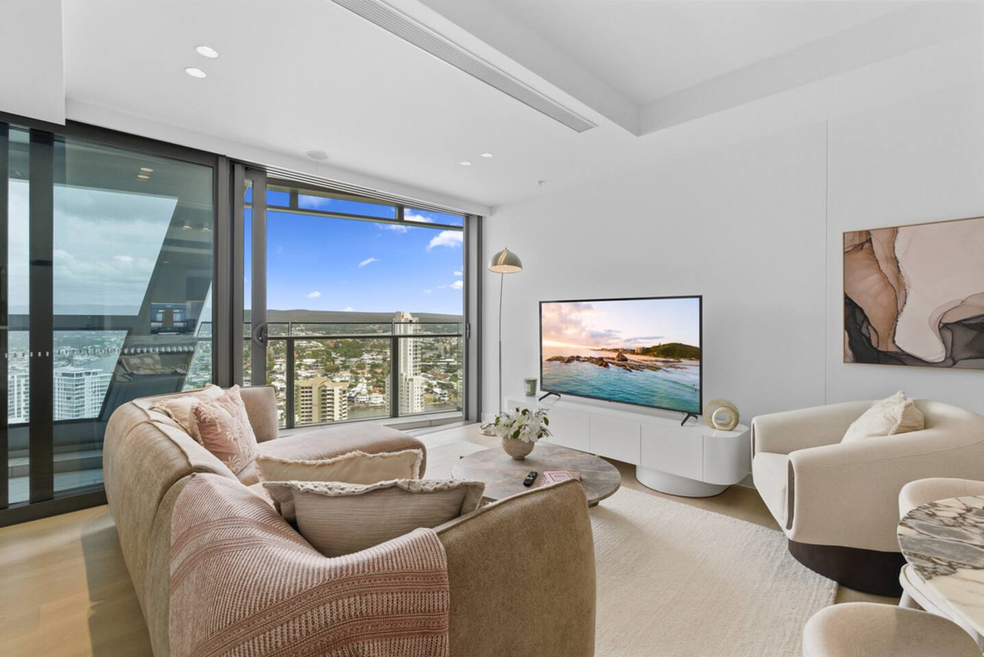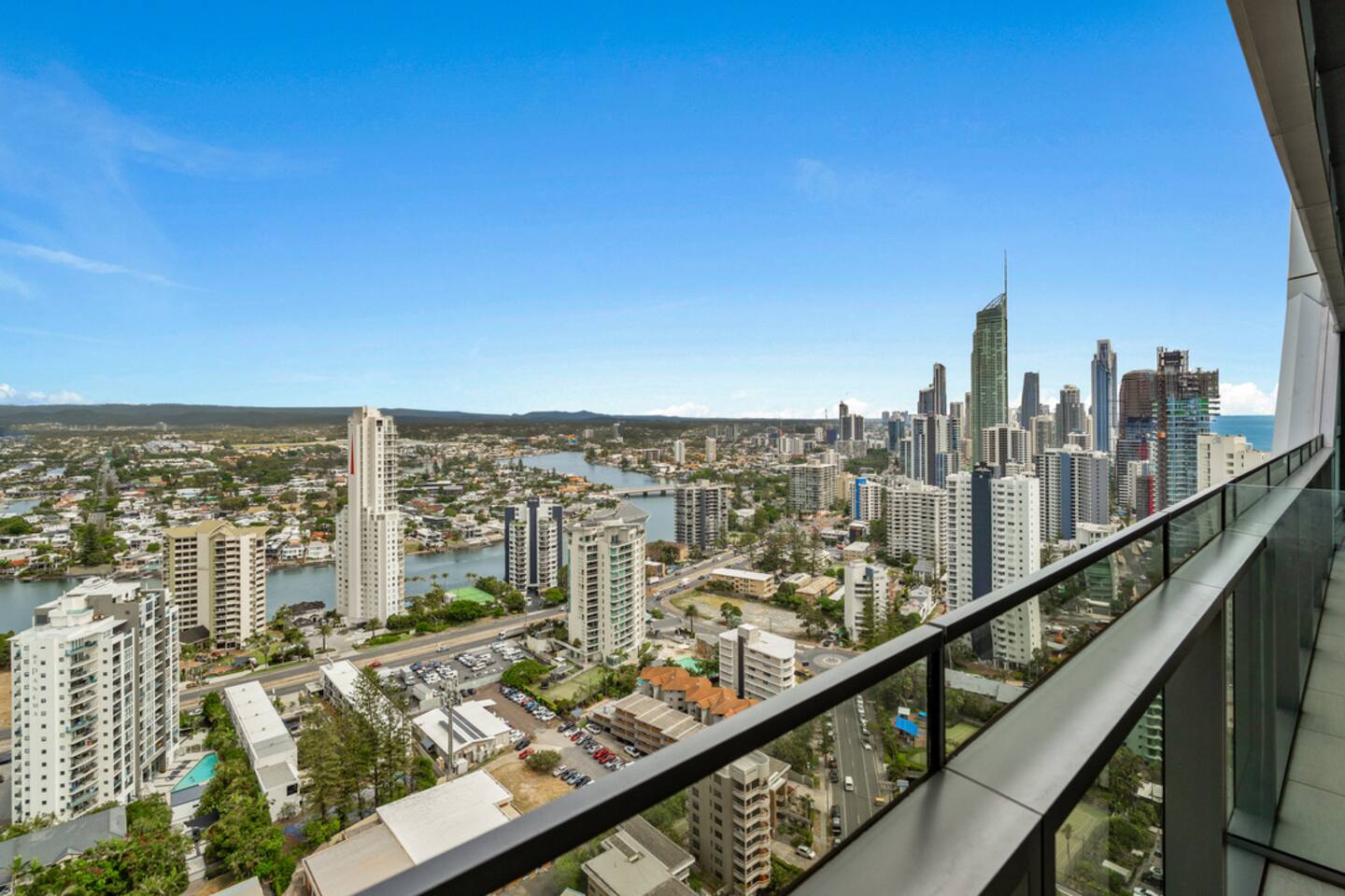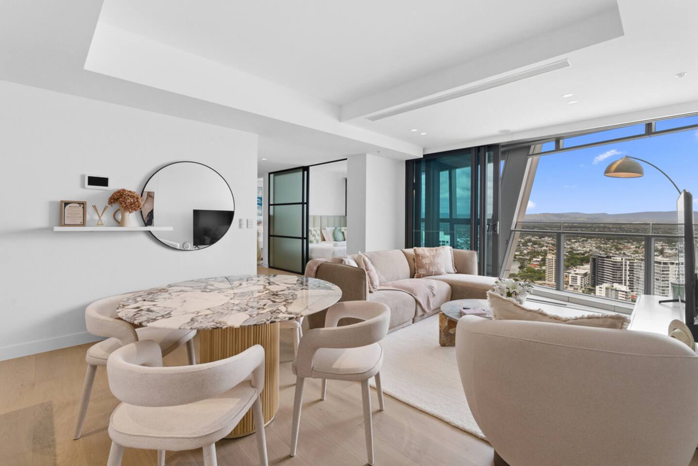 Welcome to your private sky retreat at The Jewel Residences, perfectly positioned alongside the iconic Langham on the Gold Coast. Perched high above the city, this beautifully styled two-bedroom apartment captures breathtaking river and hinterland views from the fully enclosed balcony — the perfect place to unwind with a sunset drink as the skyline glows around you.
