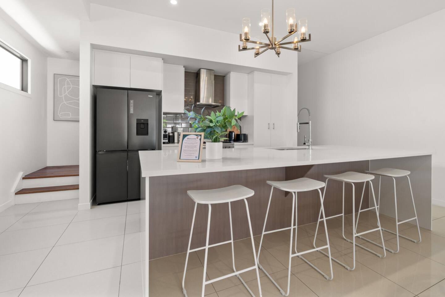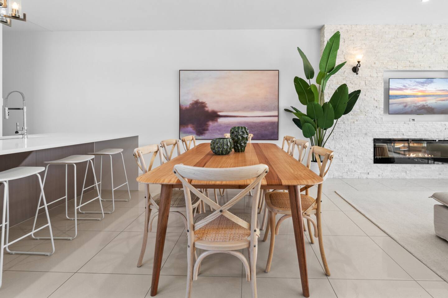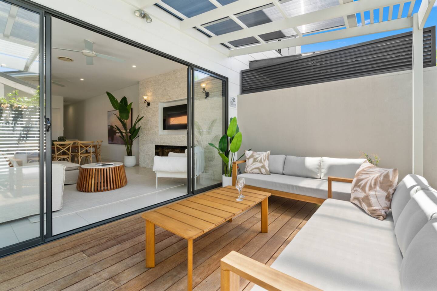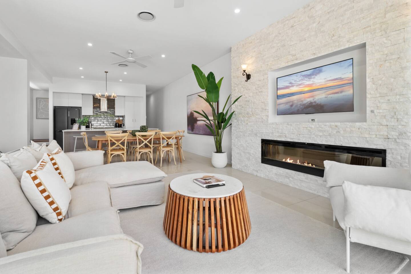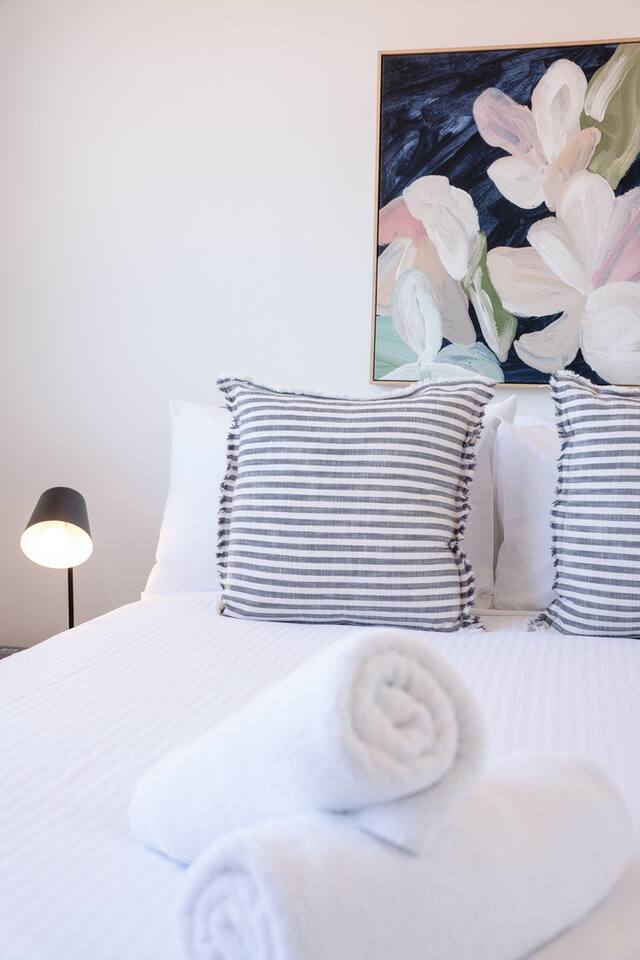 The vibe Bright, modern and coastal with brand-new designer furniture throughout—stylish, uncluttered, and genuinely comfy for families and small groups. Downstairs (living + entertaining) Open-plan kitchen & dining with a fully equipped kitchen (easy for group meals) Lounge with Smart TV for movie nights Built-in fireplace to keep things cosy in winter Dedicated office/workspace (perfect for remote work) Plunge pool + deck area for sunny afternoons Carpark on-site Ducted air-conditioning + fast Wi-Fi Upstairs (sleeping + second living space) Second living room with second Smart TV (great for kids/teens or two families sharing) 4 bedrooms (all with ducted A/C + built-in wardrobes): Master: King bed Bedroom 2: Queen bed Bedroom 3: Queen bed Bedroom 4: Two single beds Hotel-quality linen provided for every bed Brand-new beds & mattresses for that “just checked into a boutique stay” feeling Why guests love stays like this Walkable Palm Beach location near the sand, food and coffee—plus a pool, two living zones, and a proper workspace so everyone can spread out.