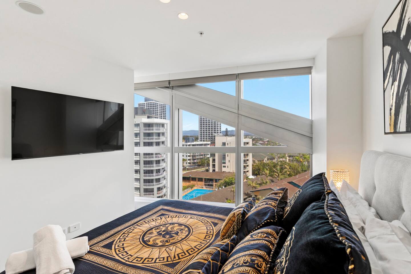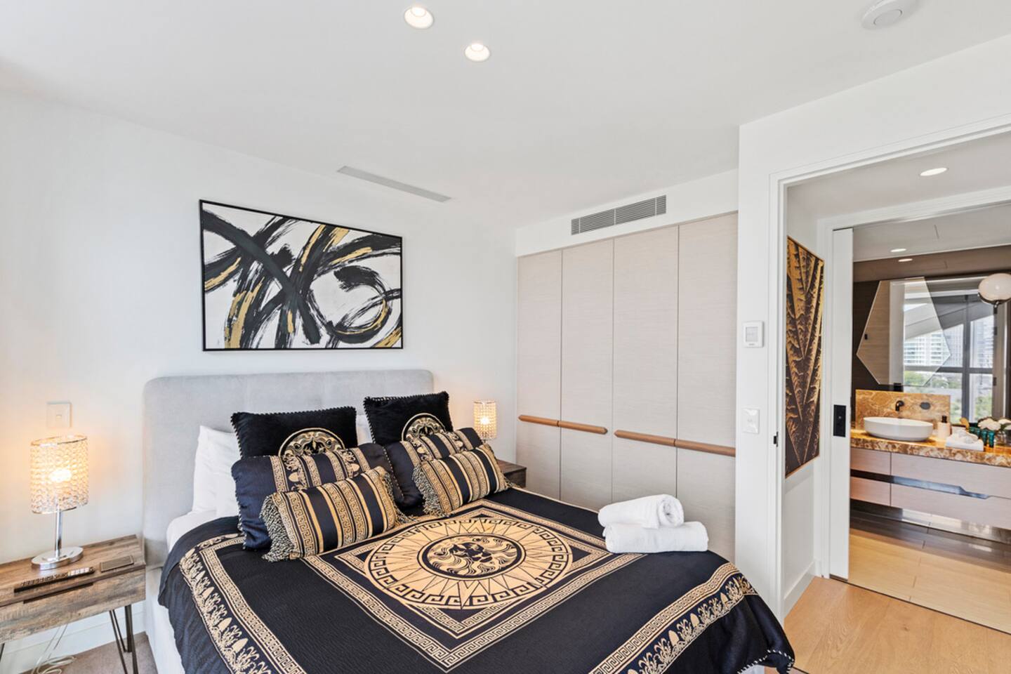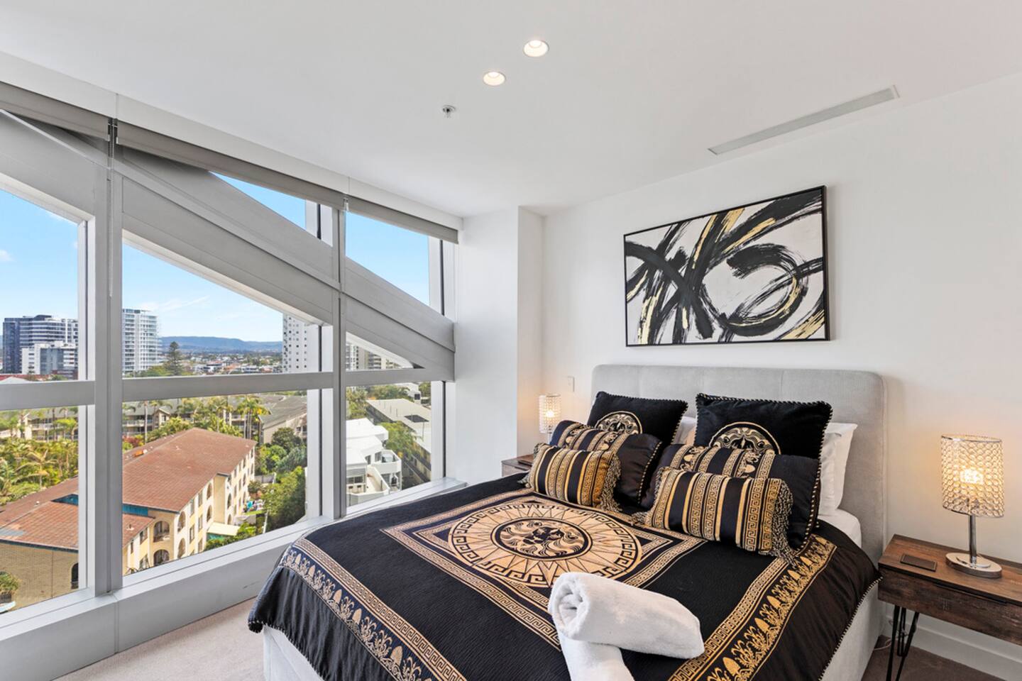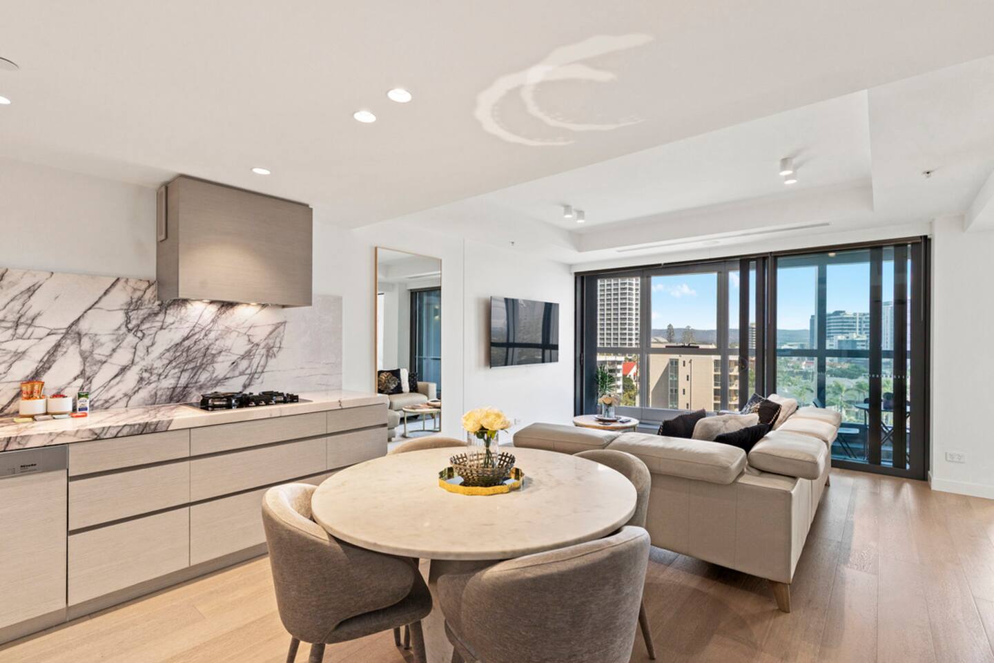 Located on Level 6 of the prestigious Jewel Residences / The Langham on the Gold Coast. Open-plan living & dining with modern finishes and access to a small balcony (table + chairs) overlooking the cityscape—perfect for morning coffee or sunset drinks. Fully equipped kitchen with quality appliances and everything needed for meals at home. European-style laundry (washer & dryer) to keep things fresh during longer stays. Dedicated workspace/desk ideal for remote work. Central location to beaches, dining and entertainment across Surfers Paradise. Sleeping arrangements 2BR (sleeps 4) Bedroom 1: Queen bed with premium linens. Bedroom 2: Queen Sofa be with premium linens On request Bathroom Contemporary bathroom with shower, toilet and vanity; sleek fixtures and quality amenities -Towels and complimentary starter kit of products provided. Guest access Resort facilities: Outdoor pools with swim-up bar, gym, sauna, steam room and spa. Concierge & conference rooms available within the Langham complex (subject to building availability/fees). Complimentary secure parking for one car. Amenities Inside the apartment Full kitchen (oven, cooktop, microwave, fridge, dishwasher) Coffee/tea setup Dining area & lounge Balcony w/ seating (city views) Bedroom with premium linens European laundry (washer & dryer) + iron/board Fast Wi-Fi & Smart TV Dedicated workspace/desk Air conditioning Building / resort Outdoor pools + swim-up bar Gym, sauna, steam room & spa Conference rooms (subject to availability) Secure parking (1 space)