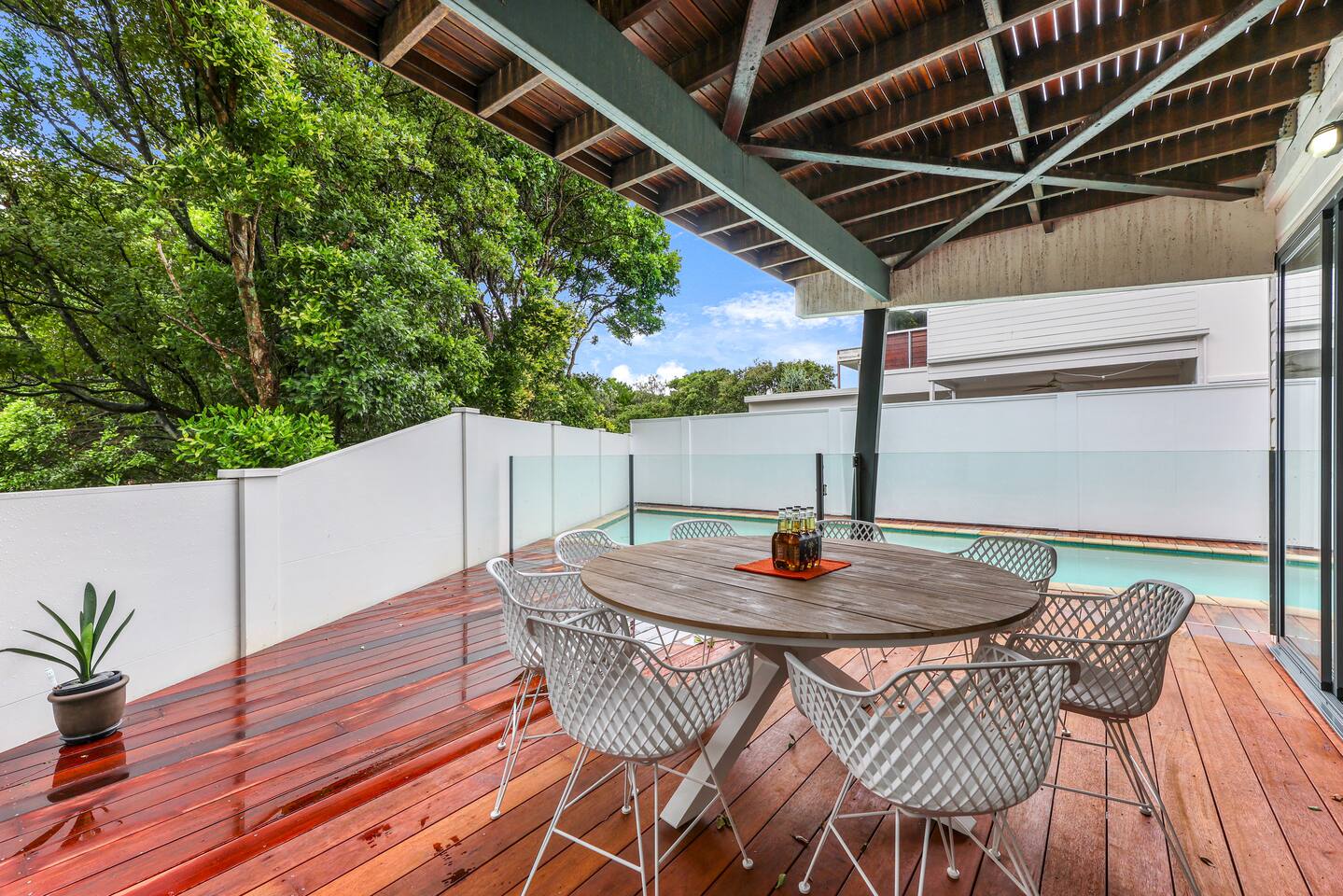 Your stunning beachside residence is ideally designed to accommodate up to 12 guests, making it perfect for a range of gatherings including wedding groups, surfers’ retreats, and corporate weekends. Lower Level: Bedrooms: The ground floor features; 1 x Queen Bedroom with desk and wardrobes 1 x Twin single room with desk and wardrobes that ensure comfort and privacy for all guests. Each room is designed with a unique touch and equipped with essential furnishings, soft lighting and desk for functionality. Double showers, sinks and toilet downstairs. Fully equipped laundry Secure double garage with remote. Living Areas: There are multiple living spaces on this level, providing ample room for relaxation and socialising. These areas are ideal for casual gatherings, entertainment, or peaceful downtime. Outdoor Decking: The newly installed outdoor decking is a highlight, offering an expansive area for dining and relaxation. It is equipped with a modern barbeque setup, perfect for evening gatherings or daytime lounging. Pool Area: Adjacent to the decking is the inviting pool area, which is perfect for cooling off or lounging by the water in a serene environment. Upper Level: Bedrooms: Additional bedrooms on this floor provide spectacular views and are crafted to ensure your comfort and convenience. 1 x King master bedroom with large ensuite, walk in robe and large lounge retreat. 1 x Queen bedroom with desk and wardrobe 2 x Twin Single bedrooms Large bathroom with twin sinks, spa bath, shower and toilet. Living Spaces: The upper level also hosts living areas where guests can retreat for more intimate conversations or simply enjoy the tranquility. Complete with Pool table in the large rumpus room with television and library. Balconies: Enjoy breathtaking views and fresh ocean breezes from the balconies that overlook the surrounding natural beauty. Additional Features: Location: The house is ideally located next to a park and the pristine beach at Casuarina, New South Wales, offering easy access to outdoor activities and serene walks. Amenities: Fully equipped with modern amenities, the house ensures that every aspect of your stay is catered for, from the kitchen appliances to entertainment facilities. This residence is not just a place to stay; it’s a destination that offers a unique blend of luxury, comfort, and natural beauty, ensuring a memorable experience for all types of gatherings and retreats.